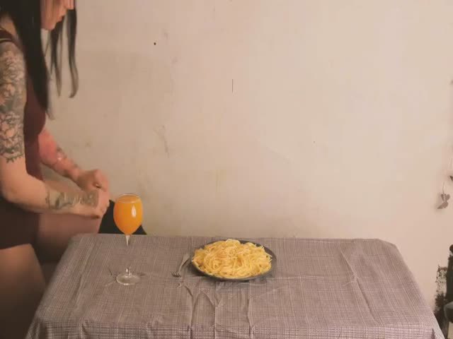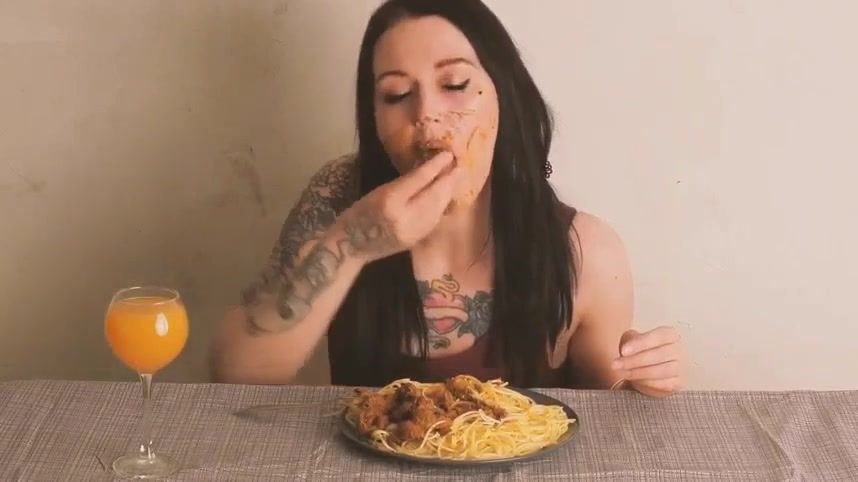 Naughty girl decides to eat a lot of poop. She mixed it with boiled pasta.