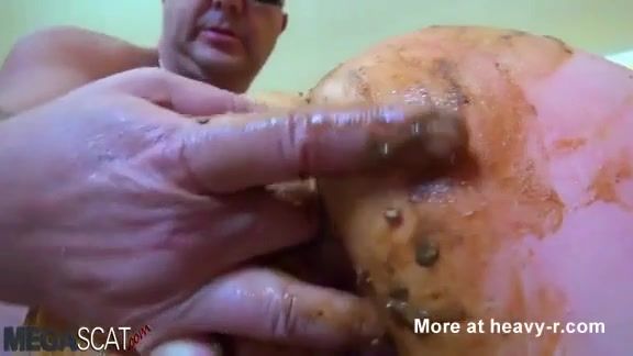Old man is slapping a young brunette girl over the ass hard until her skin turned red. After that he starts smearing crap on her entire ass.