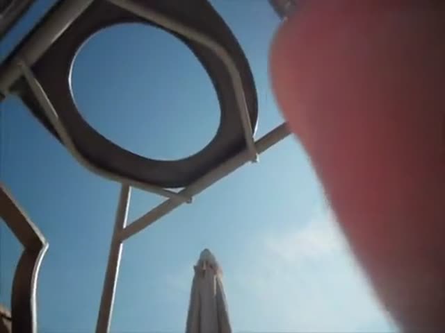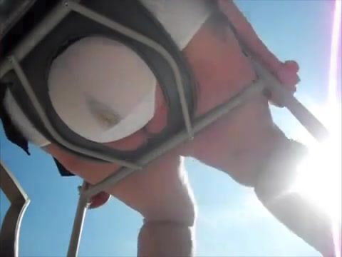 Fat girl shitting in white panties while sitting half naked on a homemade toilet, outdoor.