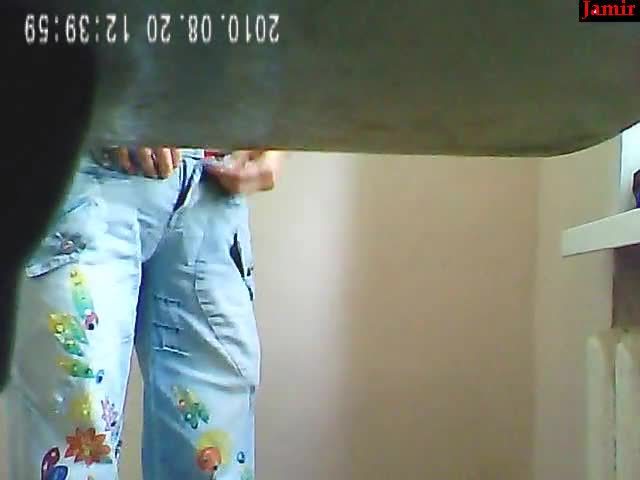 Sexy teen surprised by a hidden camera while she's peeing into a public bathroom. She's farting loud in the same time.
