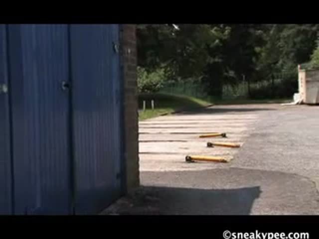 Sexy babe fingering her pussy while peeing behind a metallic blue container.