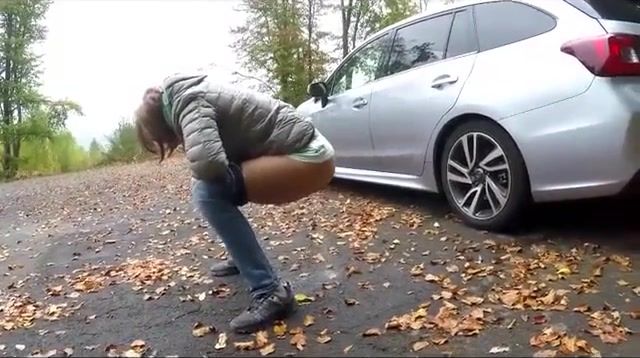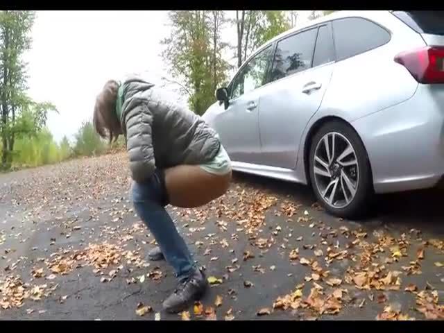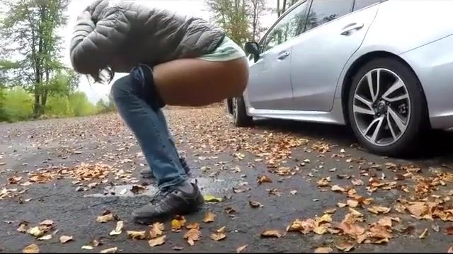 Tanned girl decides to pee with pressure behind a parked car. She couldn't find a public bathroom in time.