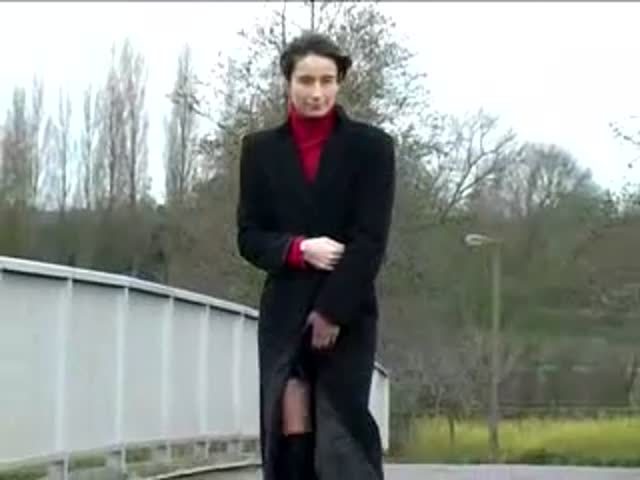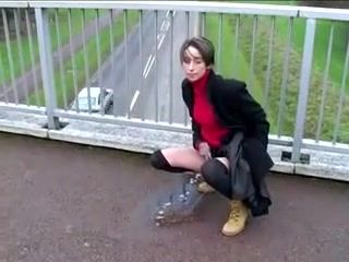 petite brunette babe is peeing on a concrete bridge. She wiped her wet pussy afterwards.