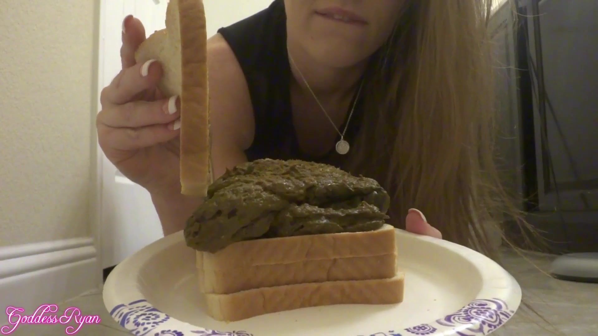 Perfect college girl doing a scat sandwich. She's wearing a tight black dress and she wants to eat that poop later on.
