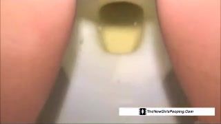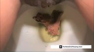 Brunette pierced girl is shitting a long turd over the toilet. She's talking to the camera while shitting.