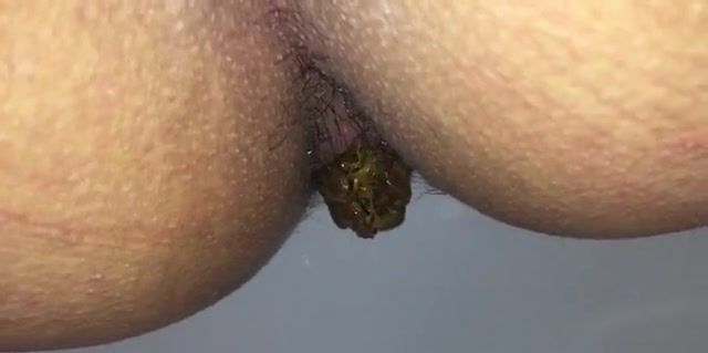 She sits naked on toilet and she's pushing a big turd in toilet.