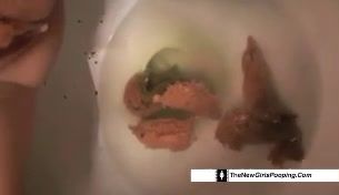Hot babe pulled down her pink panties so she can poop easily in the toilet. She wiped her asshole with white toilet paper.