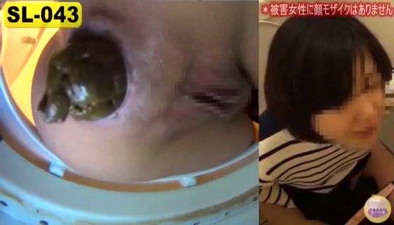 Dark haired teen went to poop a lot in a public bathroom. She's pushing a big green turd from sexy ass.