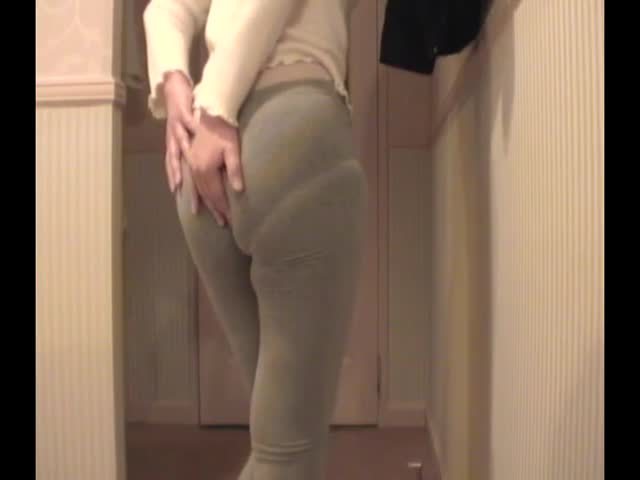 Brunette babe did a real mess in her new grey pants. She needs to clean that mess before leaving.