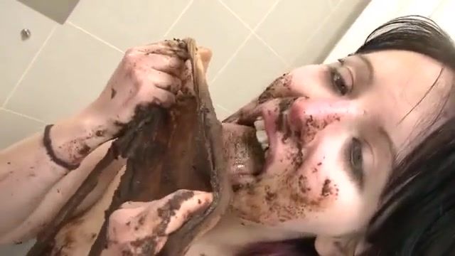 Beautiful brunette did a real mess in her brown pantyhose. She covered her entire body with shit as she masturbates with it.