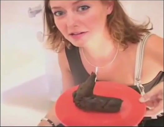 Blonde babe is really proud of her long turd that she just dropped on a red plate.