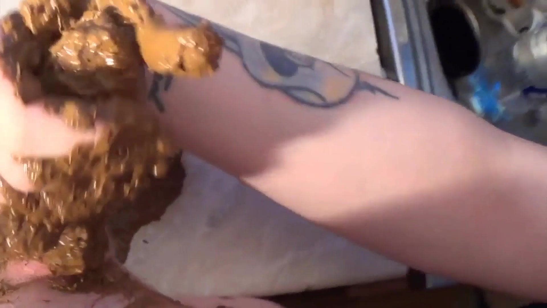 Redhead babe smears shit on her pretty face and ass. She takes a fat cock inside her pussy, moaning loud.