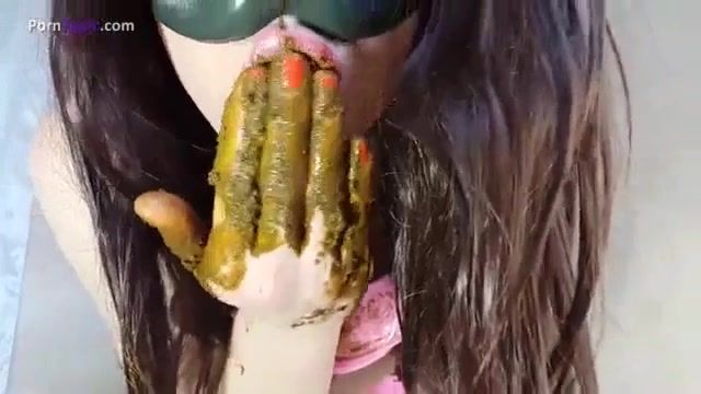 Dark haired college girl smears brown shit on entire body. She masturbates with crap until reaching climax.