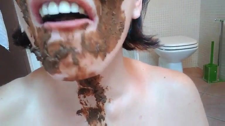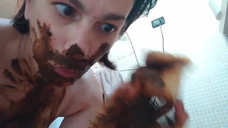Rubbing fresh shit on her face before she starts eating poop from a white plate.