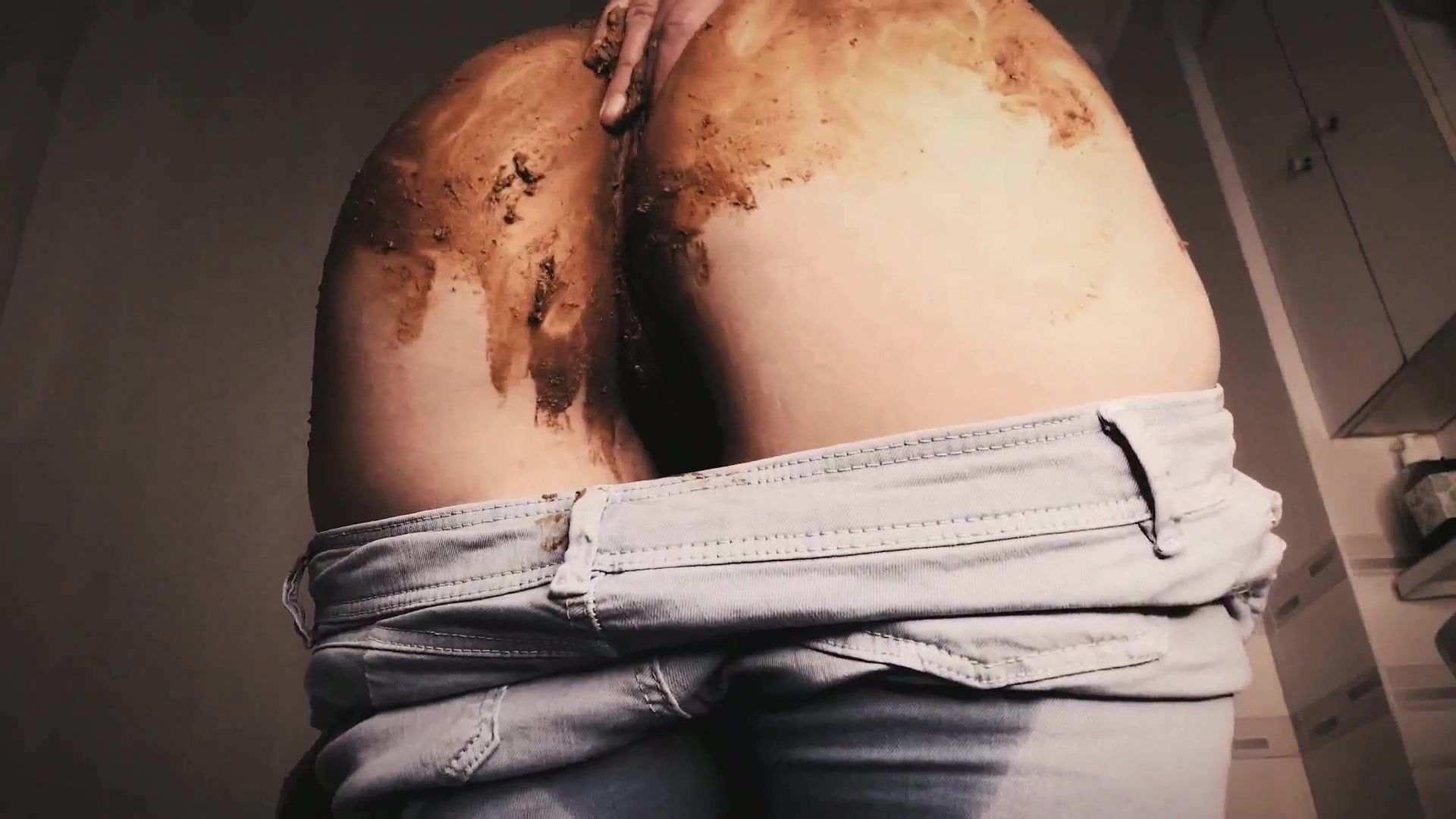 Dark haired teen smears brown shit on amazing ass. She masturbates with poop.