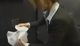 Hot blonde secretary that's wearing a black office outfit is pooping in an elevator. She wiped her ass with her white panties.