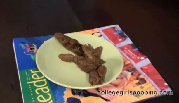 Sexy babe is pooping a big pile of green shit on a green plate. She was really proud of her fresh shit.