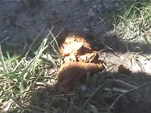 Sexy woman that's wearing a black leather jacket is pooping on the ground, outdoor.