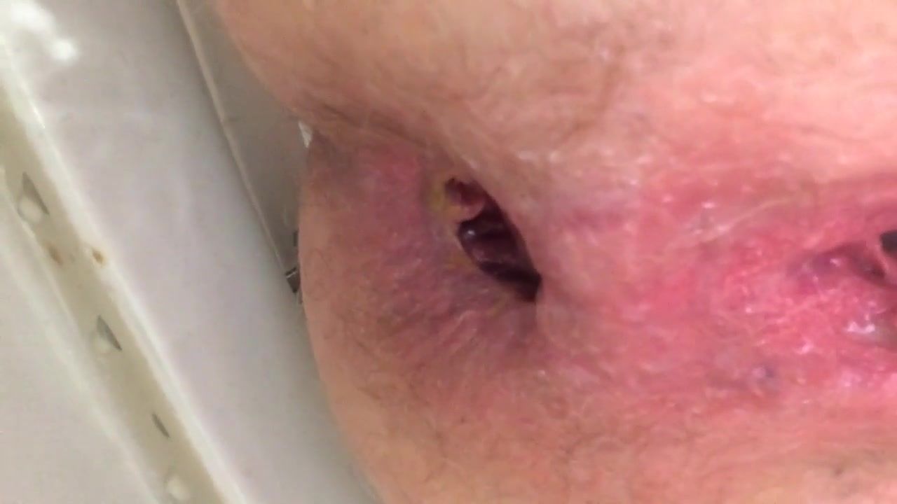 Shaved girl records everything in close up while she's peeing and pooping on bathroom floor.