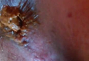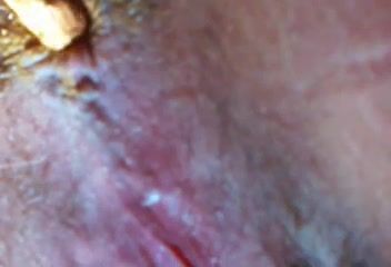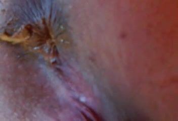 Shaved girl is pooping a tiny yellow shit in close up on the bathroom floor.