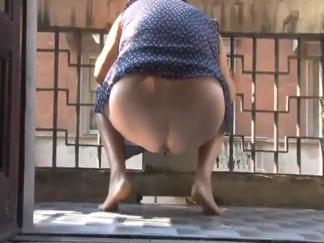 Chubby housewife decides to poop on balcony floor because her home toilet is not working.