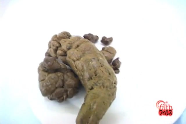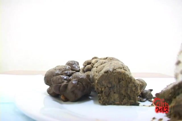 Brown haired Japanese girl wants to inspect her own poop so she dropped a hard turd on a white plate.