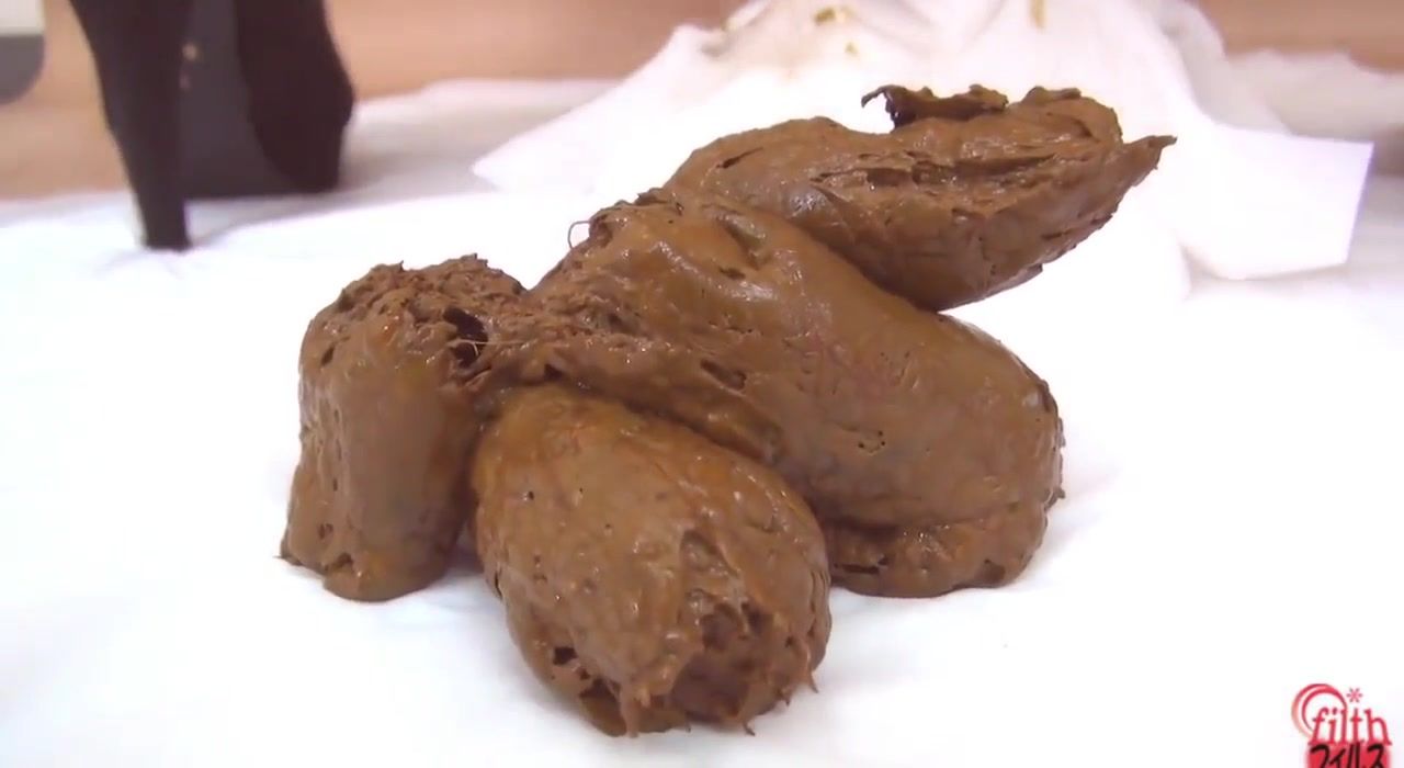 Japanese babe sits half naked on her knees, dropping a big pile of shit on floor. She wiped dirty ass with toilet paper.