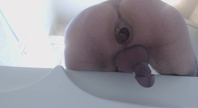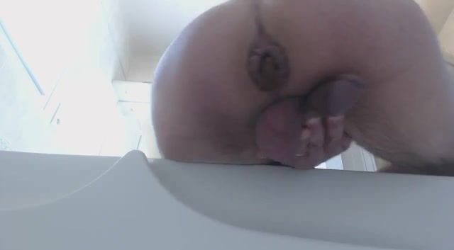 Mature man records his ass in close up and he's pooping and peeing a lot in bathroom.