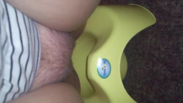 Horny wife is pooping in a green potty cause her home toilet was out of service.