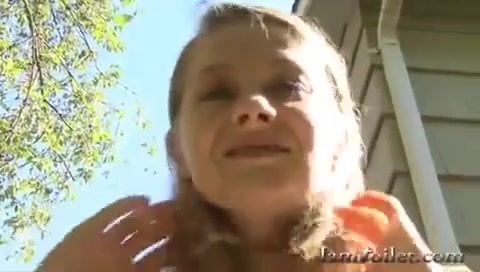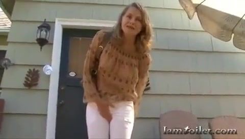 Brown haired girl is pooping in her white pants by mistake. She didn't have enough time to reach public bathroom.