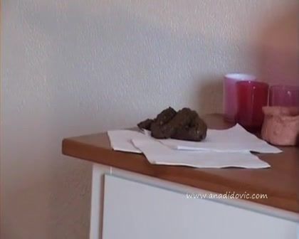 Sexy babe dropped a big pile of poop on a wooden table. She didn't wipe her ass before leaving.