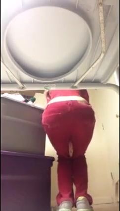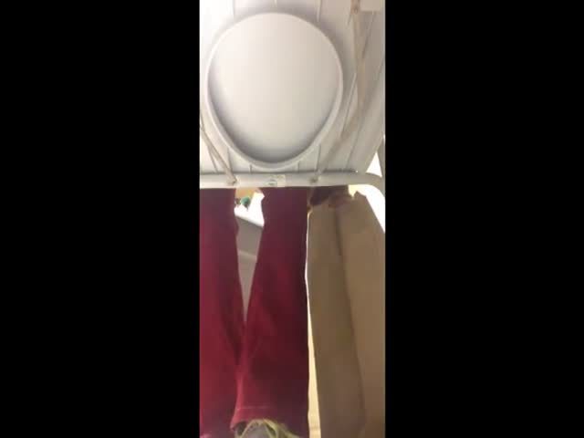 Amateur girl sits half naked on a white homemade toilet as she's pooping a lot on bedroom floor.