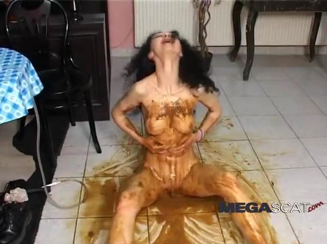 Skinny brunette covered her naked body with liquid shit. She smears poop especially on her tits.