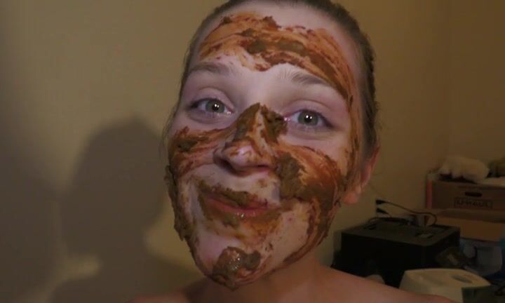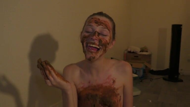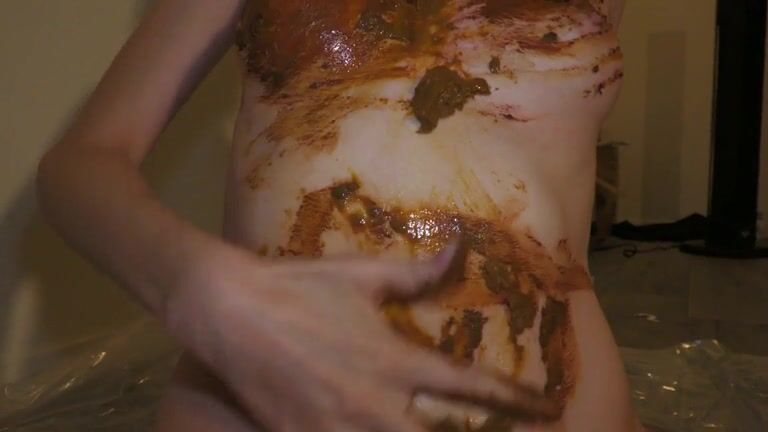 Skinny brunette gal smearing shit on her body and face