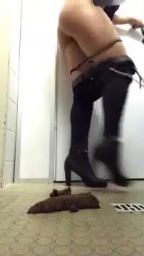 Slutty teen that's wearing a mini skirt starts pooping on bathroom floor. She wiped her dirty ass with toilet paper.