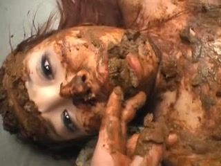 A sexy Japanese girl sits naked on the floor while a random guy is smearing fresh shit on her entire body.