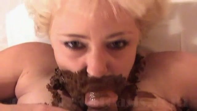 Mature blonde babe smearing crap on her face. She begged her younger boyfriend to piss on her face.