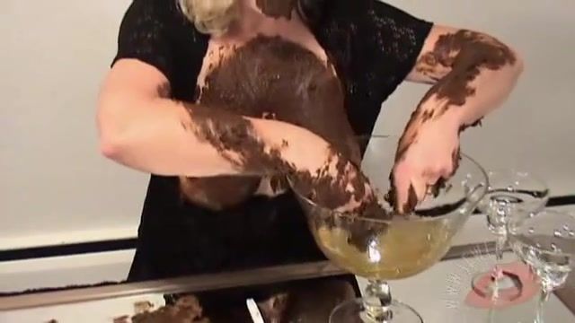 Blonde Romanian woman smearing fresh shit on her big boobs while eating poop with a plastic fork.