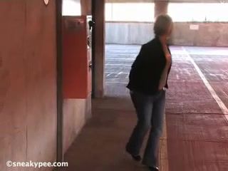 Blonde babe is smoking a ciggarete while she's peeing in an underground parking lot.