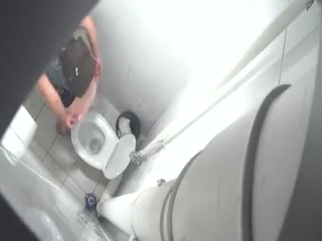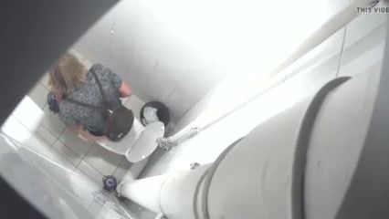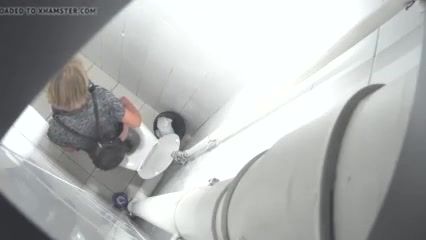 He's using a hidden camera to spy on a blonde milf that's pooping in a public bathroom.
