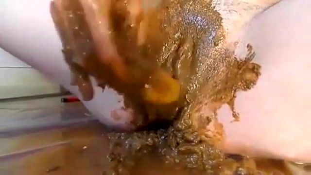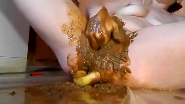 Amateur girl stuffed her shaved pussy with fresh shit. She's fingering her tight cunt until orgasm.