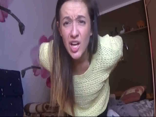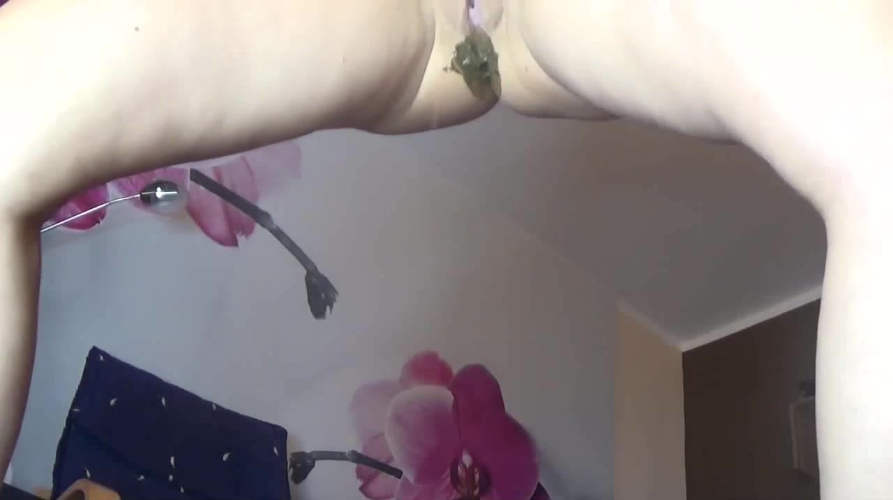 Brown haired teen is talking dirty while pooping a lot in white panties.