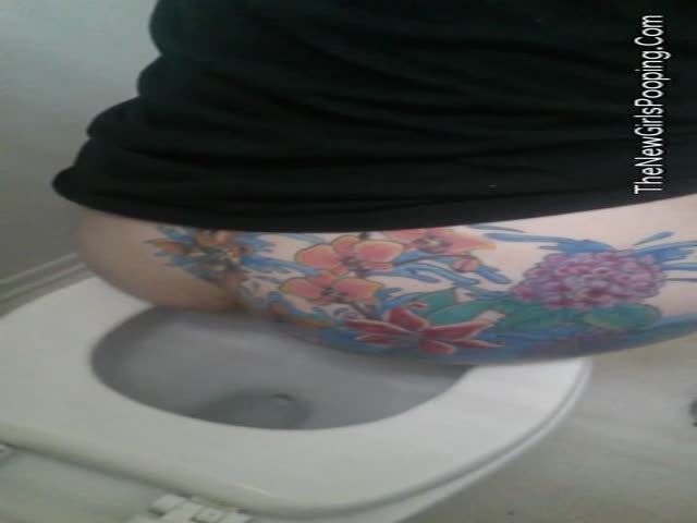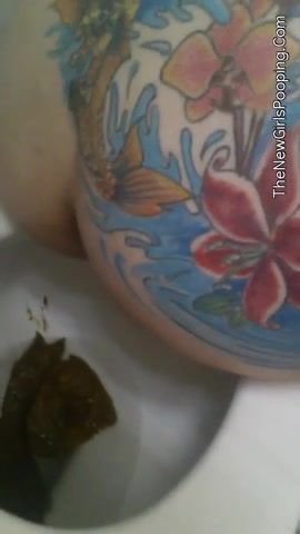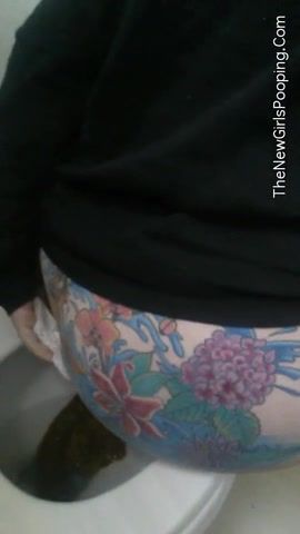 She has a massive tattoo on her big ass and she's pooping a lot in toilet.