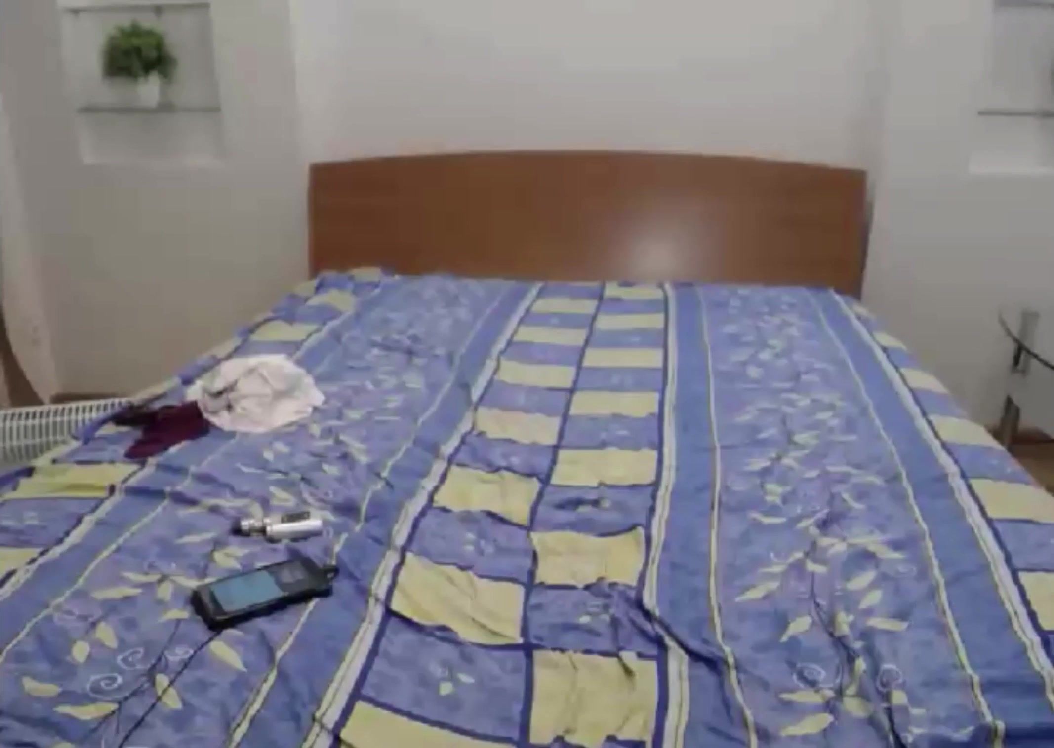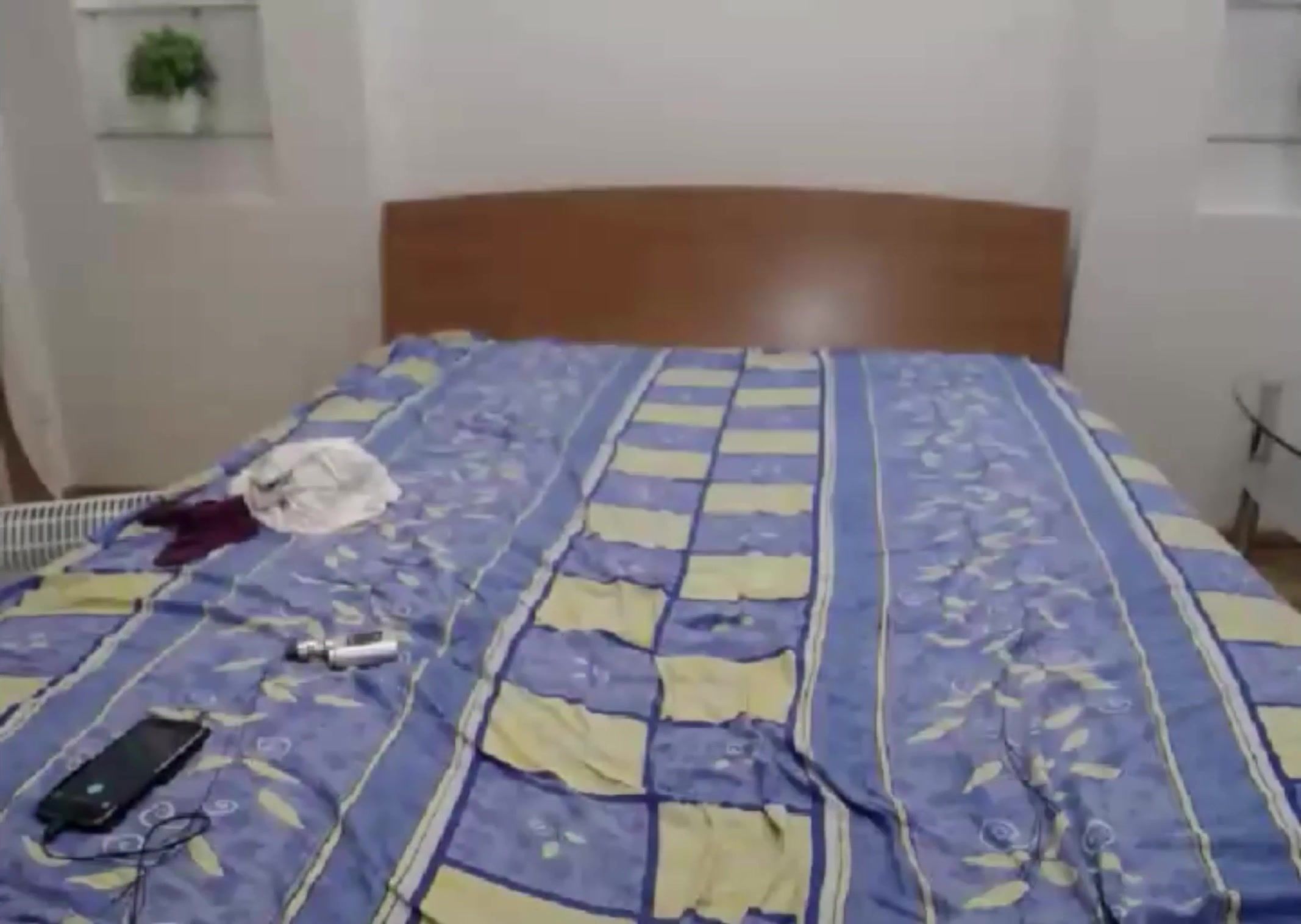 Tattooed teen shits on bed by mistake. She spreads her legs wide opened to easily tease us.