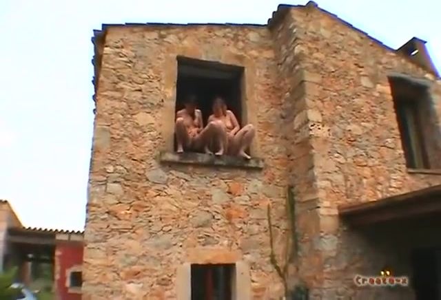 Two European girls sit naked on a concrete window while peeing with pressure together.