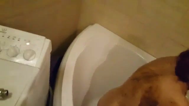 She's using saved poop to cover entire body with brown shit. She takes a shower after that.