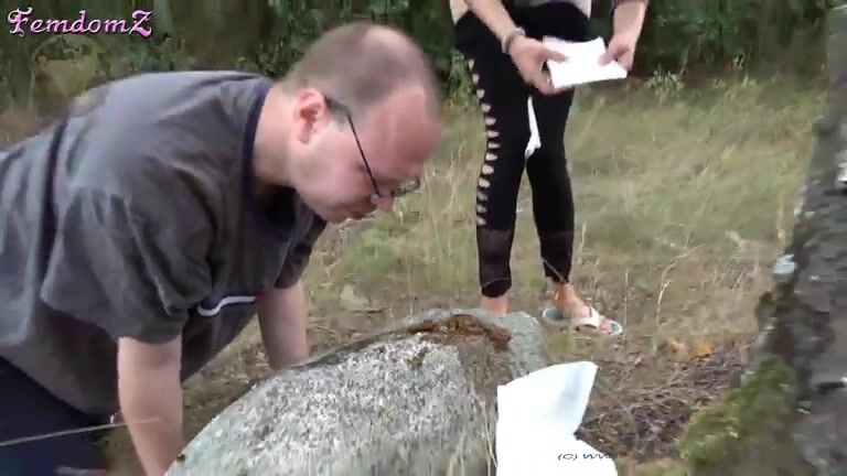 Woman in short shorts takes a shit on a rock outdoors