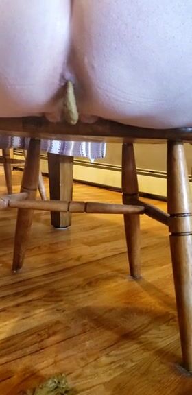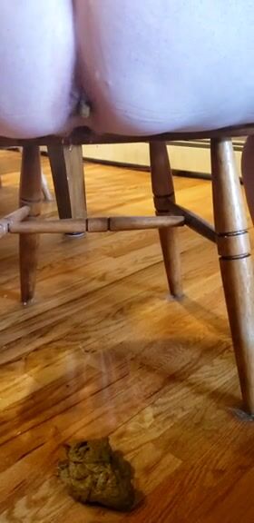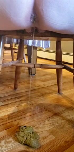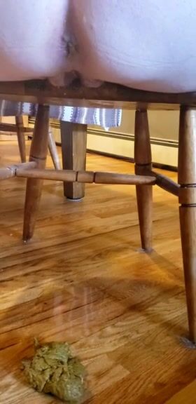 Woman shits on the floor under a wooden table