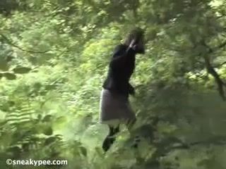 Young dark haired girl is peeing with pressure in the middle of a big forest.